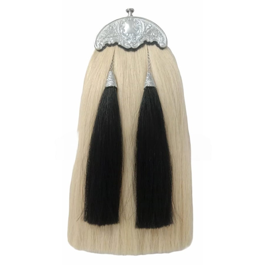 Crafted from genuine leather and finished with a striking nickel-plated brass cantle, this traditional horsehair sporran is both elegant and functional. The body features white real horsehair with two black horsehair tassels, offering a bold contrast in classic Highland style.